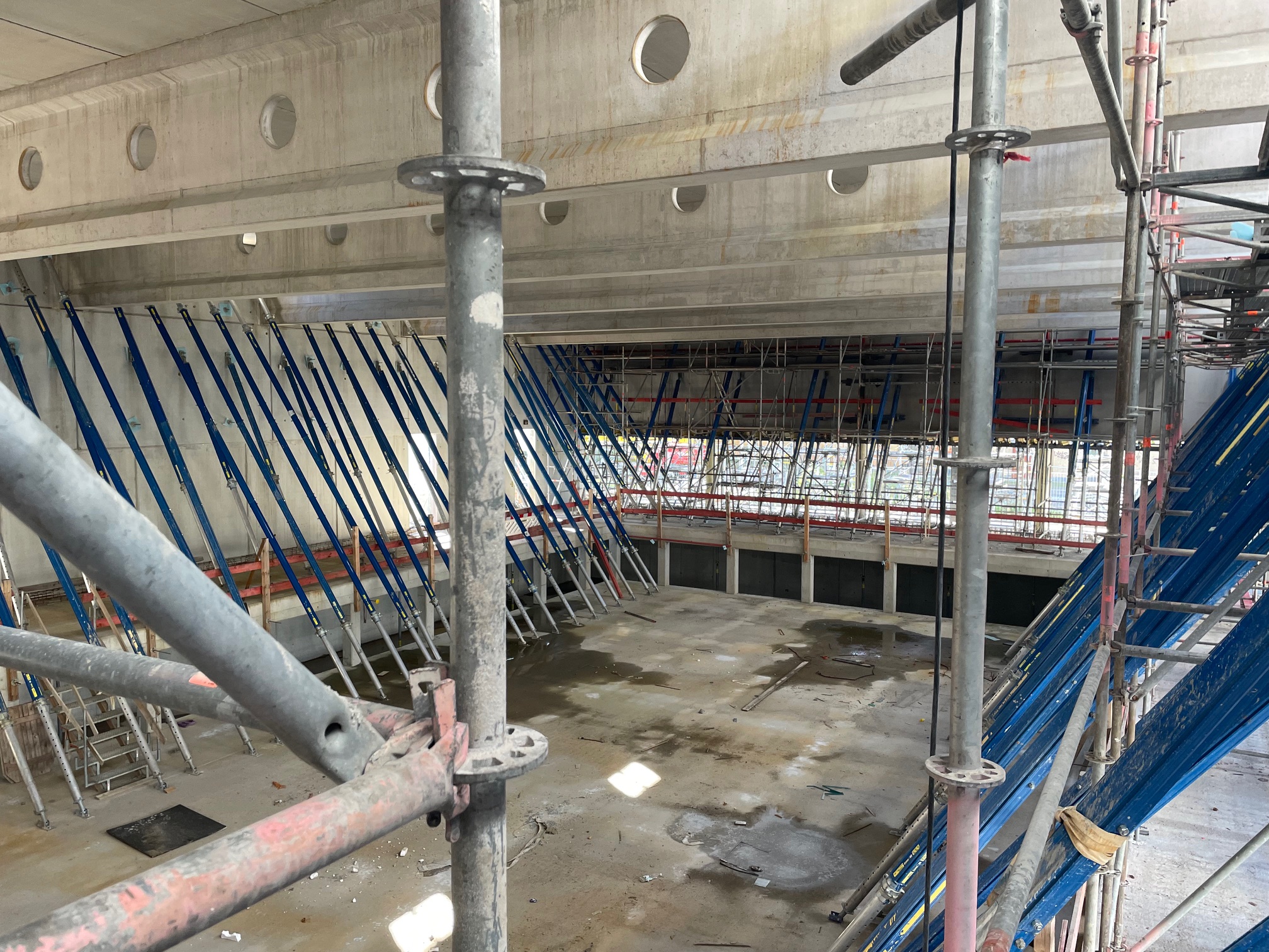Im Leipziger Stadtteil Neuschönefeld wird 2024 in direkter Nähe zur berühmten Eisenbahnstraße Leipzigs modernstes Schwimmbad eröffnet. Auf dem zuvor unbebautem und als Grünfläche genutztem Grundstück wird das Gebäude freistehend errichtet. Es soll ein 25 Meter Sportschwimmbecken, ein Nichtschwimmerbecken sowie ein Kleinkinderbecken beinhalten. Das Gebäude besteht aus Unter-, Erd- und einem Obergeschoss. Das Unter- und Obergeschoss dienen der Unterbringung haustechnischer Anlagen, während das Erdgeschoss die Schwimmbecken, Um- und Aufenthaltsräume beherbergt. Der unterkellerte Teil der Schwimmhalle wurde als WU-Konstruktion geplant. Eine besondere Schwierigkeit stellt die Bodenplatte des Untergeschosses dar, die sich aufgrund einer Vielzahl von komplexen Höhensprüngen zu einer Herausforderung für die Schal- und Bewehrungsplanung sowie die Baustelle entwickelte. Die Höhensprünge waren es auch, die es erforderlich machten, dass etliche Schwindgassen in der Bodenplatte vorgesehen wurden, um Zwängungen innerhalb der Gründung stark zu reduzieren und den Anforderungen an eine WU-Konstruktion gerecht zu werden. Eine weitere Besonderheit stellen die Spannbeton-FT-Dachbinder dar, die durch eine Spannweite von ca. 23m für einen stützenfreien Schwimmbereich sorgen. Wir wurden von den Hartwich Bernhardt Ingenieuren mit der Bauüberwachung des Rohbaus beauftragt.